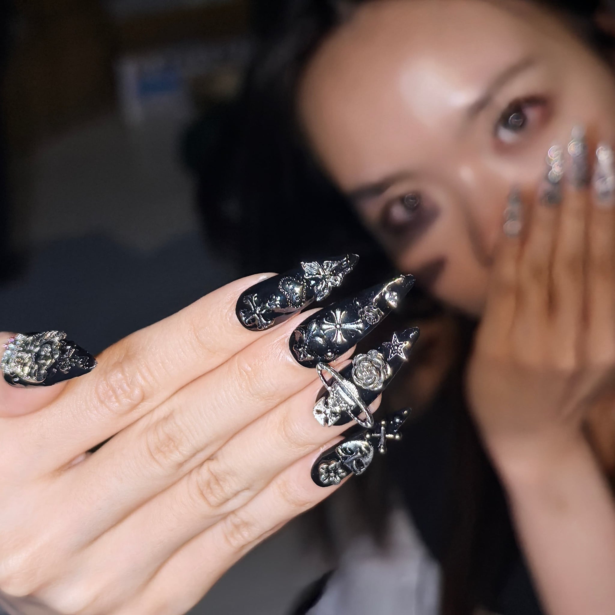 Black Dark Cute Gothic: Bold black bases decorated with 3D dark-cute elements—Hello Kitty skeleton motifs, Saturn charms, cross + rose accents, and glossy metal details—blending playful cute vibes with unapologetic gothic glamour.