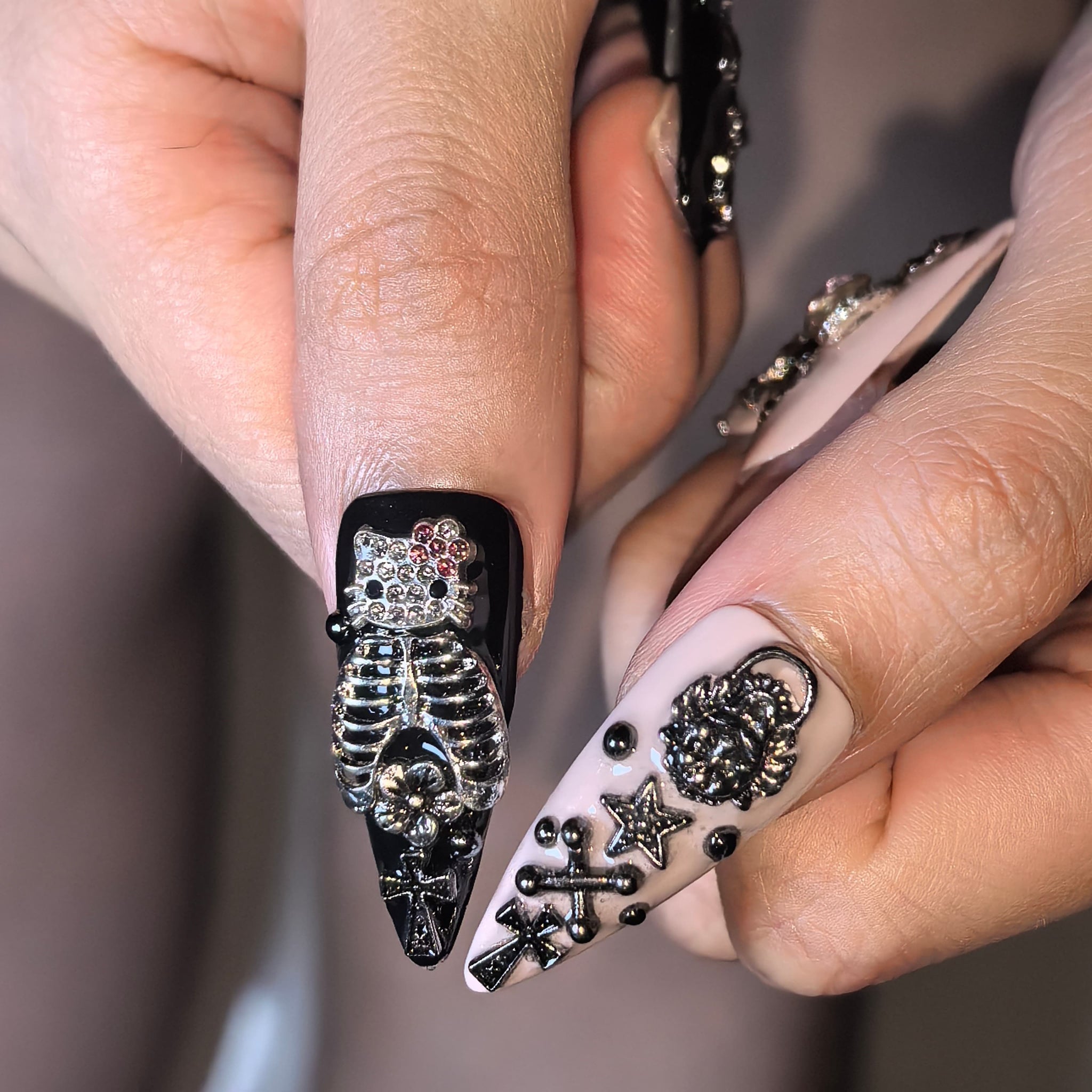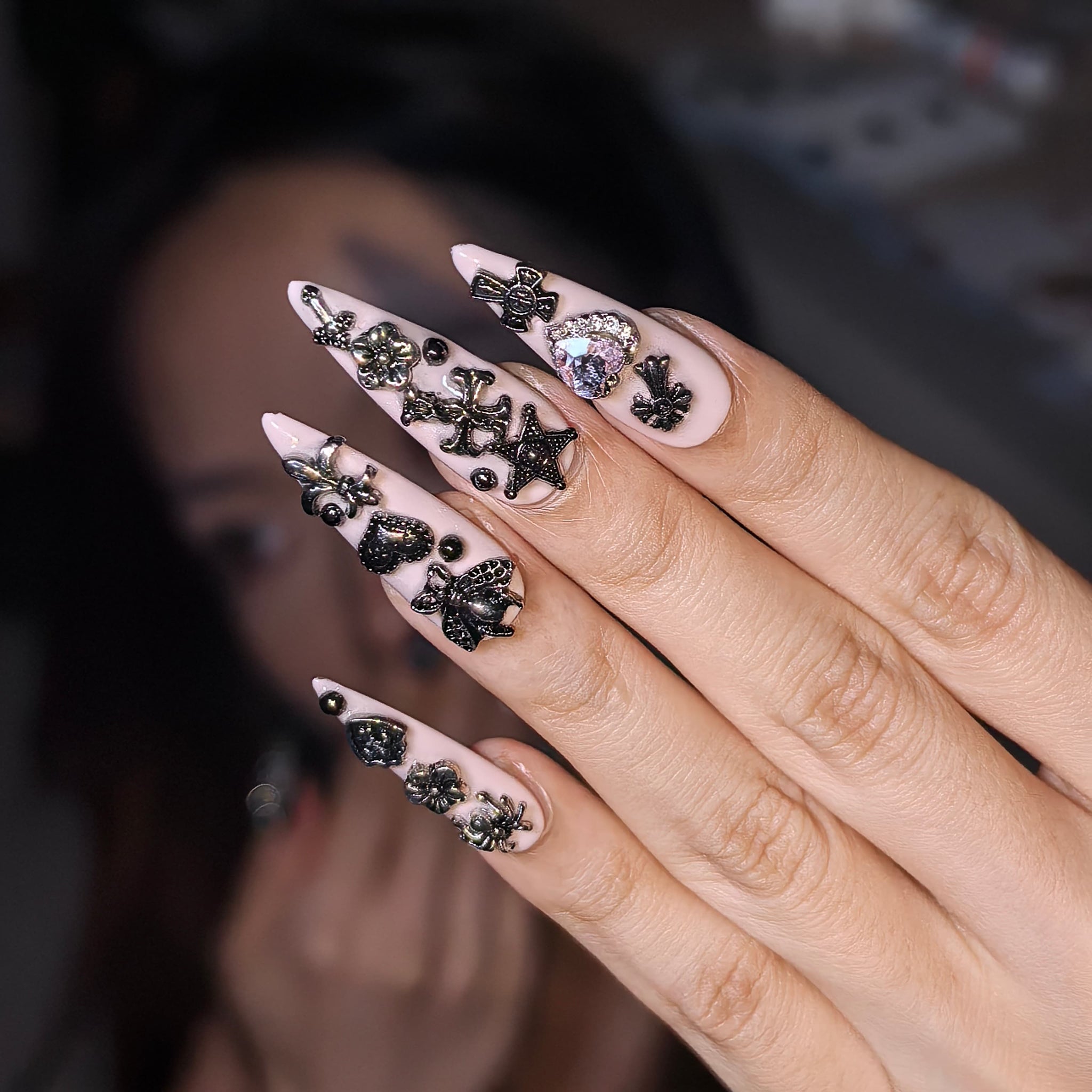 Blush Pink Gothic Metal: Soft blush-pink bases adorned with hand-placed metallic gothic details—ornate medallions, stars, crosses, spider accents, and tiny bead embellishments—merging tender pastel sweetness with sharp gothic edge.