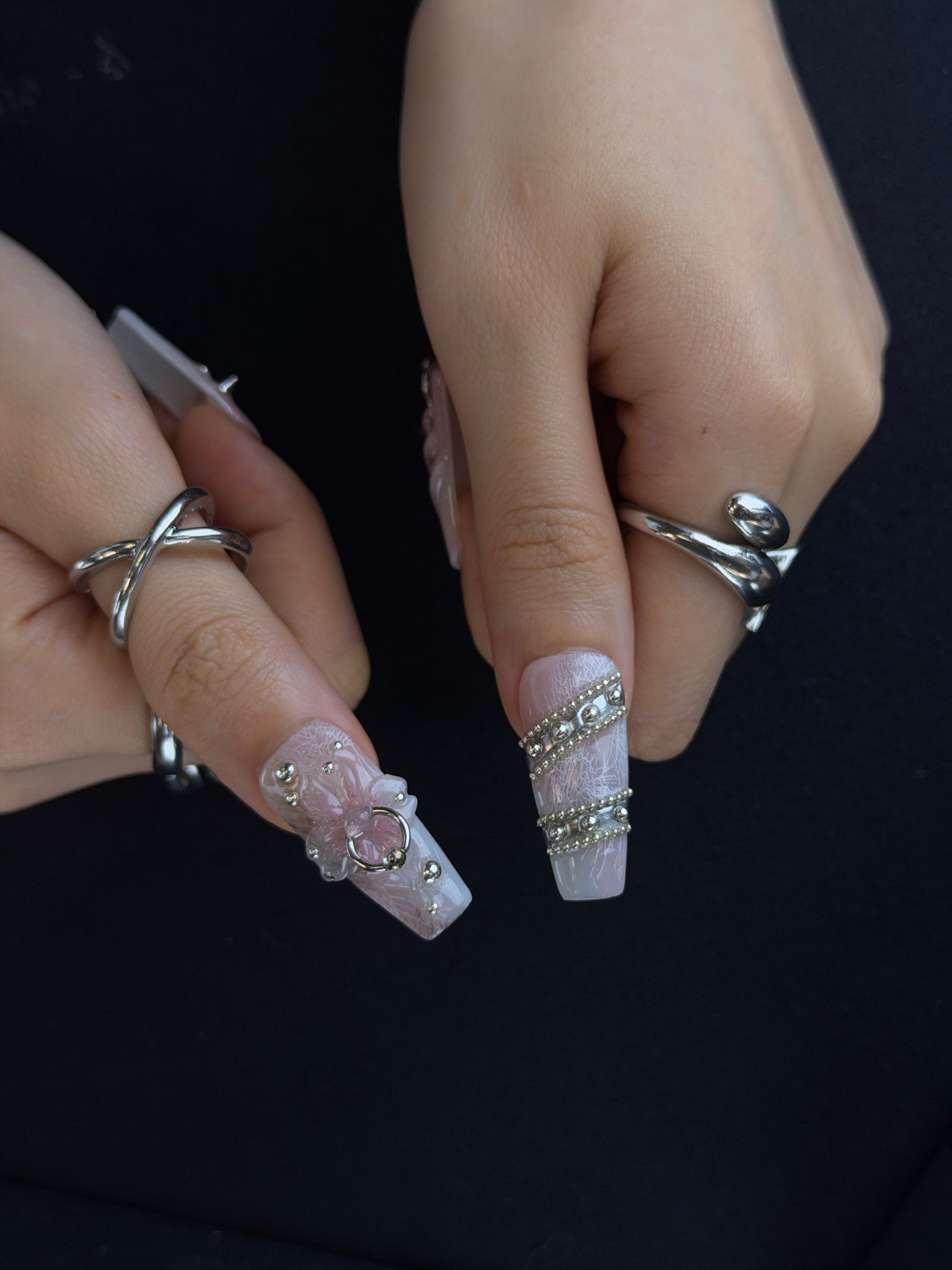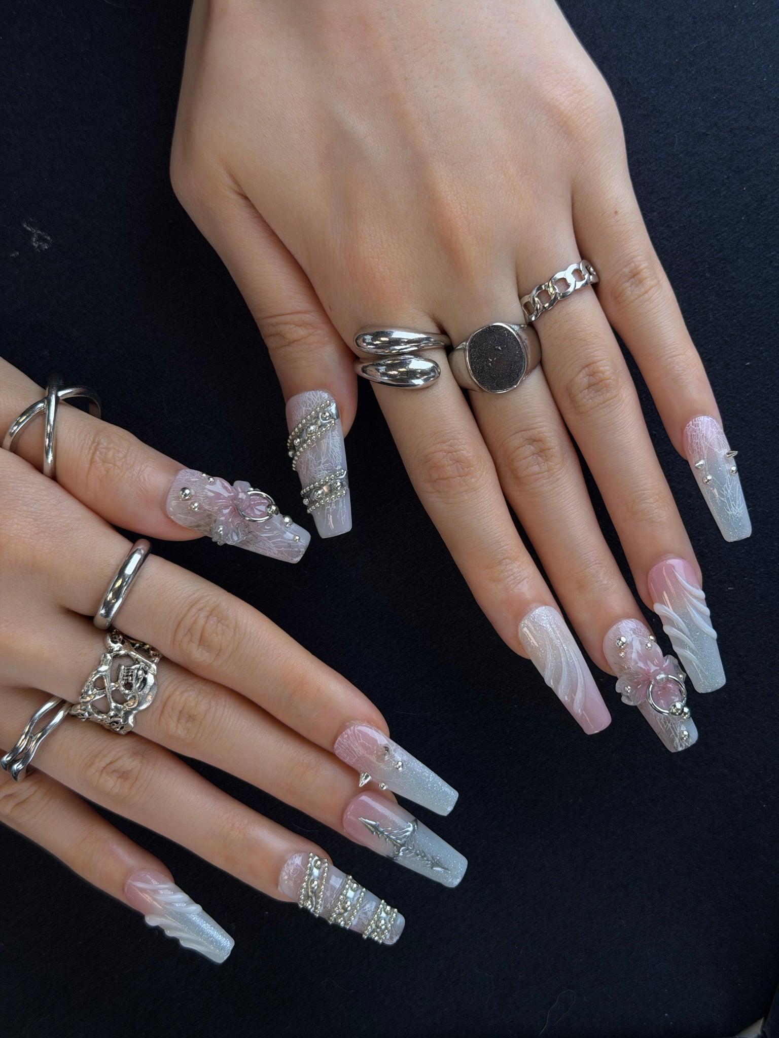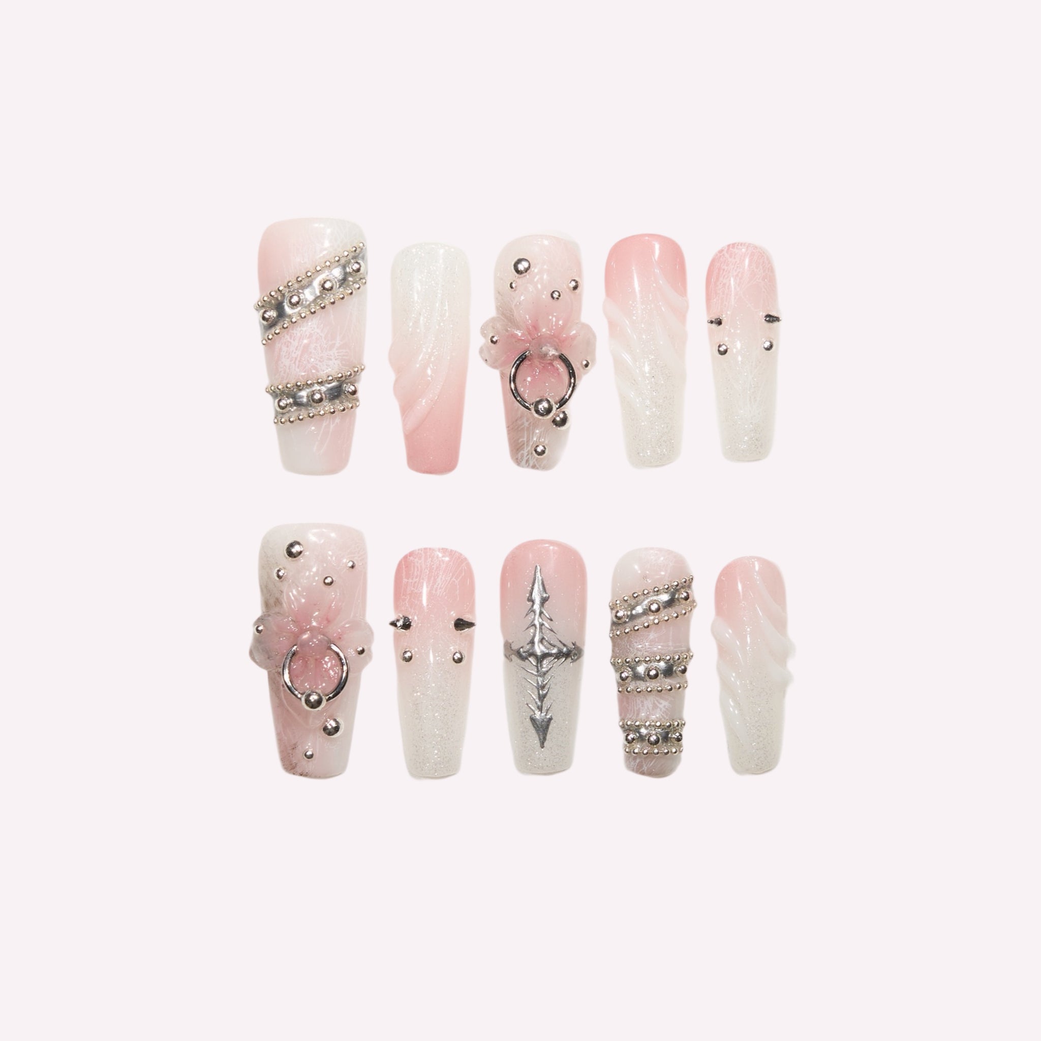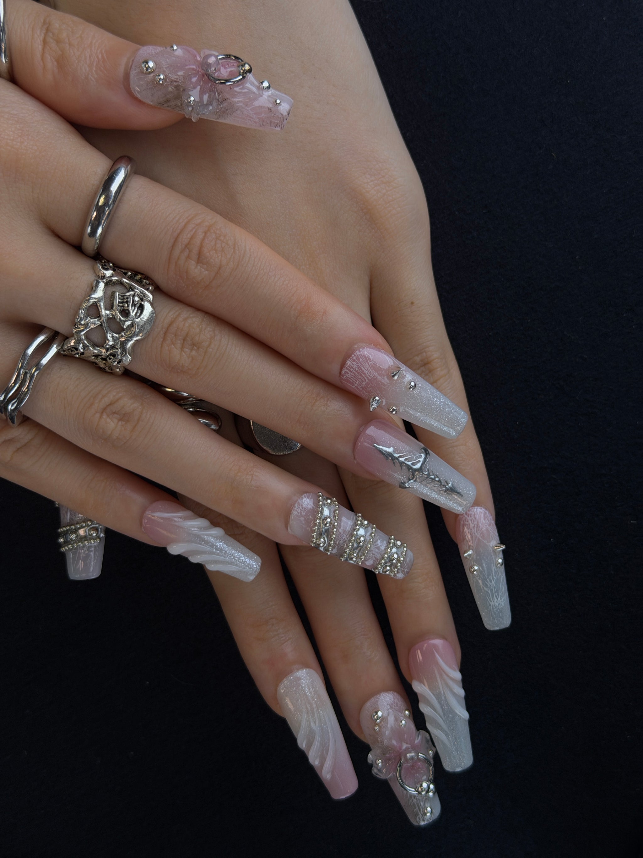 This set features a dreamy blush pink-to-white gradient base, infused with subtle glitter and delicate crackle textures that catch the light. Each nail is hand-decorated with edgy silver accents: 3D pink floral motifs with ring details, stacked silver bead chains, spiked studs, and a striking silver thorn design. The soft gradient contrasts with the bold metallic hardware, creating a layered aesthetic that balances sweet coquette romance with dark gothic edge.