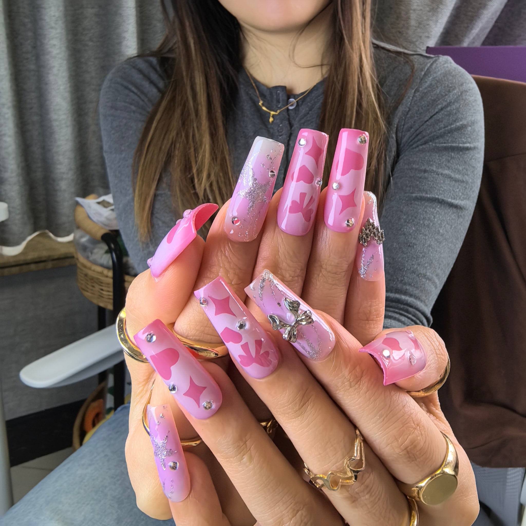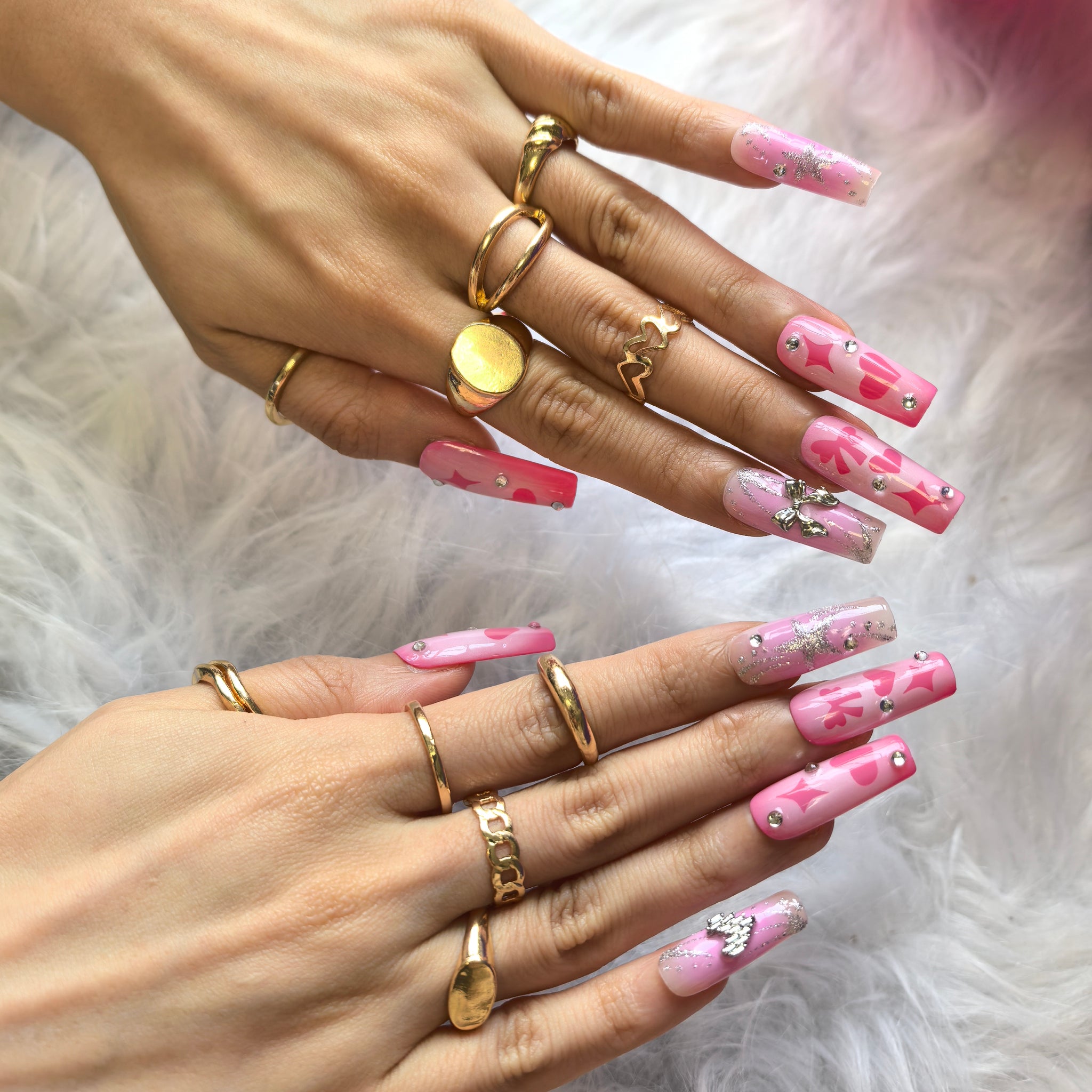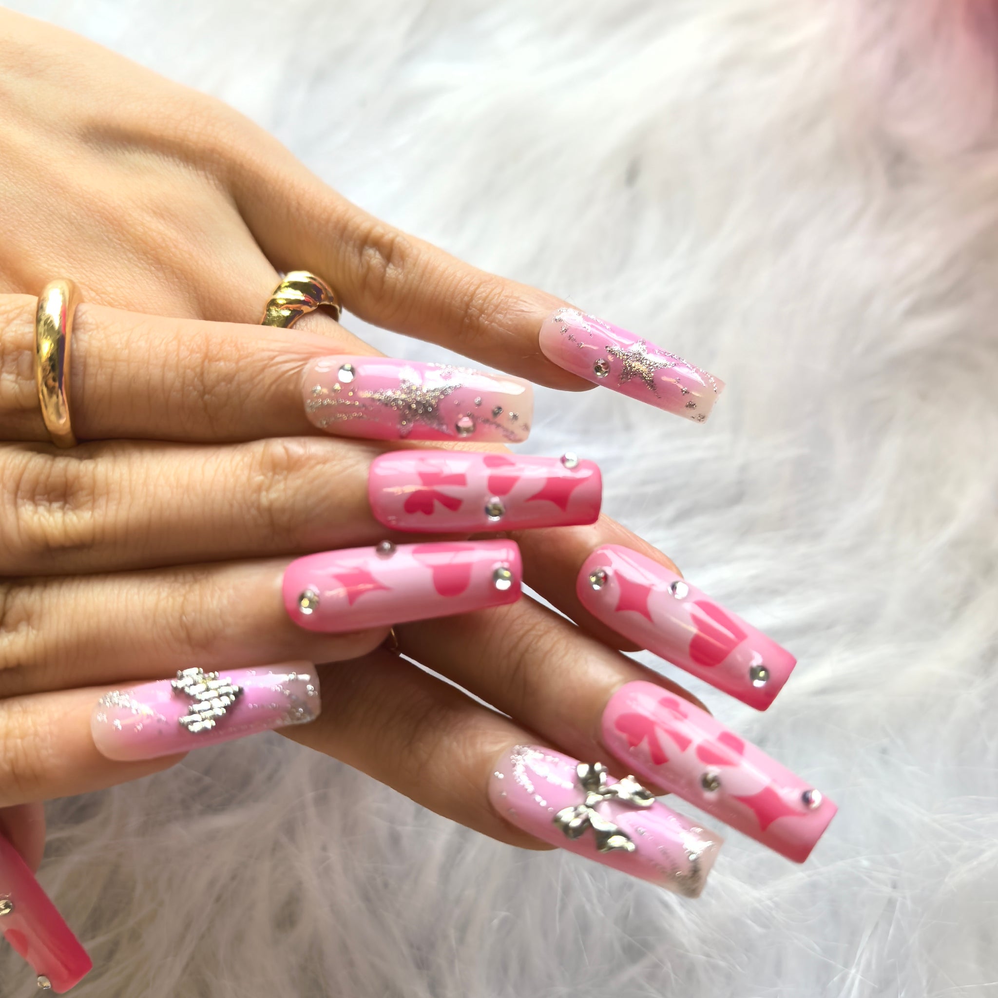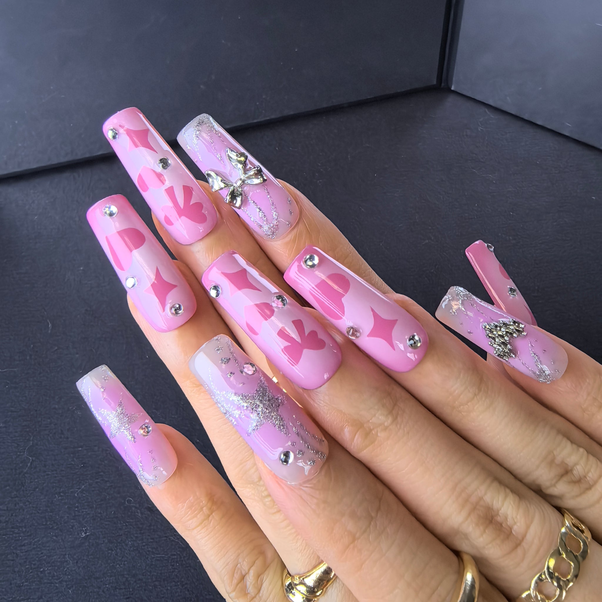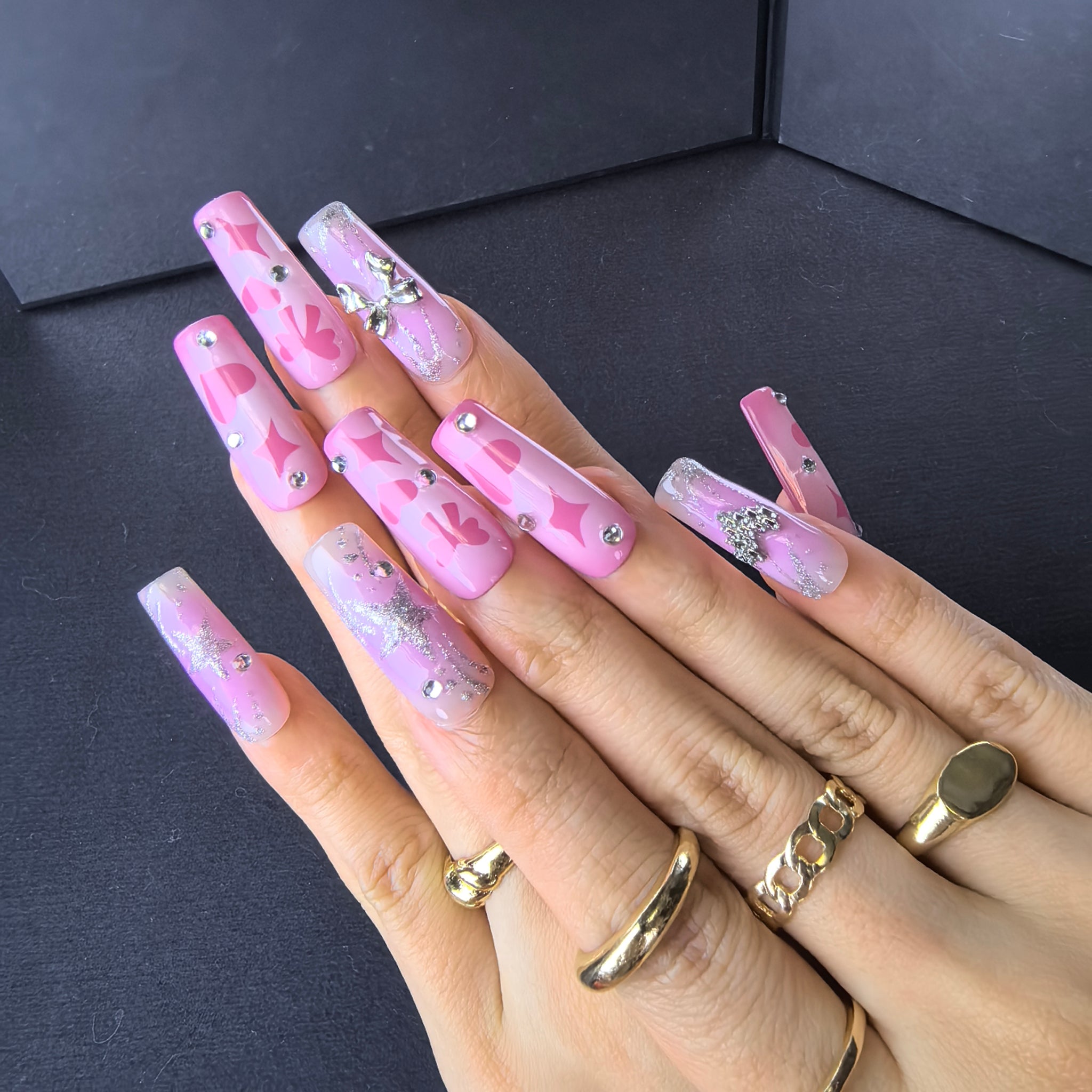 Step into a world of sweet pink coquette romance with this Handmade Pink Gradient Heart Bow Press-on Nails set—crafted for the playful romantic who adores bubbly, love-inspired nail art that feels like a Valentine’s Day dream! Made from acrylic PMMA, this biodegradable, skin-friendly material fits nails seamlessly, boasts micro-elasticity to resist chipping and breaking (far sturdier than flimsy plastic alternatives), and mimics the natural, lifelike finish of salon-quality sculpted nails. This set features a soft gradient from warm pastel pink to a lighter milky pink, infused with a subtle shimmer that catches the light like blushing cheeks. Hand-painted pink heart and star motifs add a playful, romantic flair, while delicate silver glitter lines flow across the gradient base like stardust. 3D silver bow charms and a sparkling crystal heart charm bring a touch of coquette luxury, paired with tiny clear crystal studs that enhance the sweet, feminine energy of the set. The glossy, high-shine finish amplifies the pink gradient and makes the silver and heart details pop, creating a fun, eye-catching design that balances soft romance with playful charm. Every nail is hand-finished to preserve the precision of heart and star patterns, the dimension of 3D bow and heart charms, and the smoothness of the pink gradient—ensuring the Valentine’s coquette vibe shines through in every polished, charming touch. Unlike fragile plastic nails, our PMMA press-ons retain their intricate decorative details, durable textured finish, and snug fit through daily wear, from romantic date nights to girly social outings with friends. Ideal for lovers of coquette, Valentine’s Day, and pink romantic nail art, this set lets you embrace effortless, sweet-edge charm with reusable, long-lasting convenience.