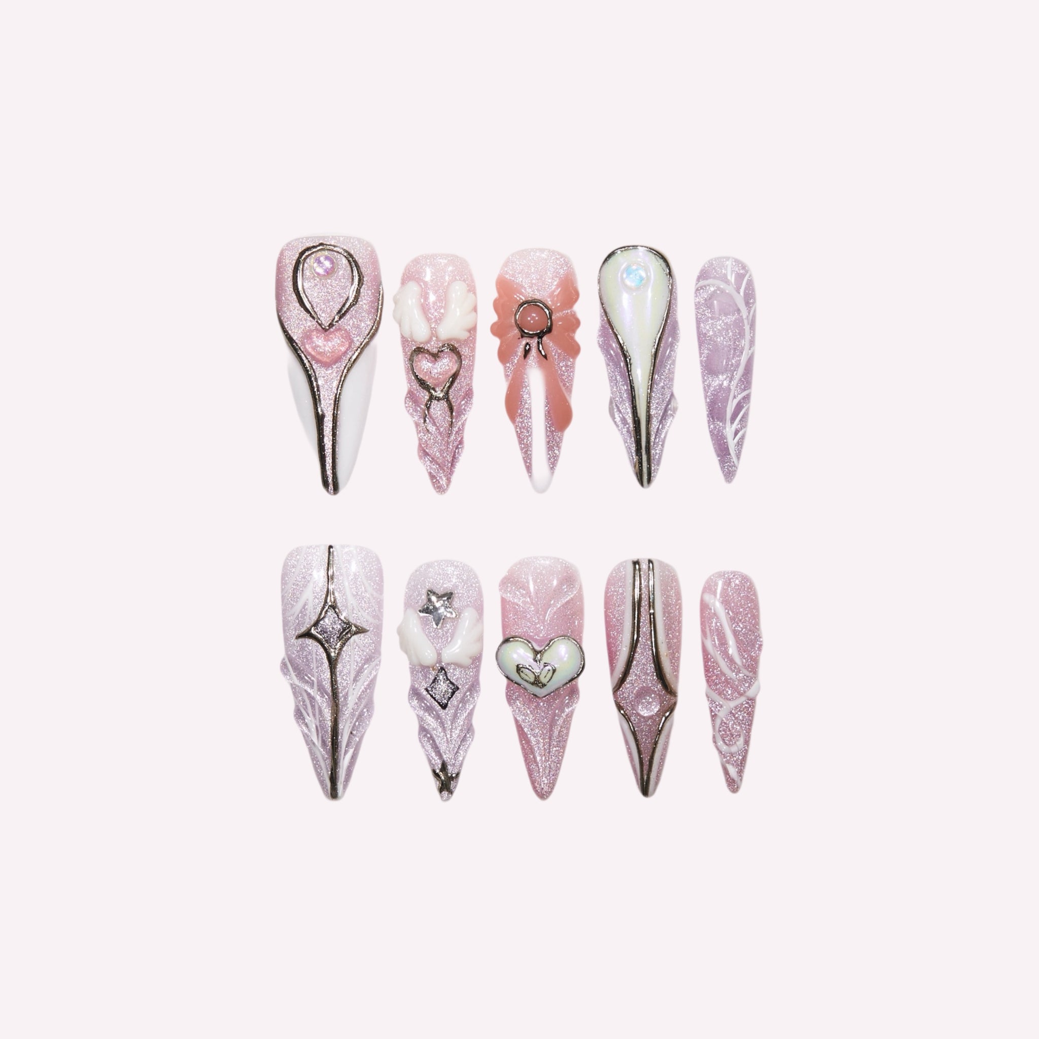This set features a dreamy gradient from shimmery pastel pink to soft lavender, infused with a fine holographic glitter that catches the light like stardust. Each nail is hand-decorated with intricate fantasy details:
