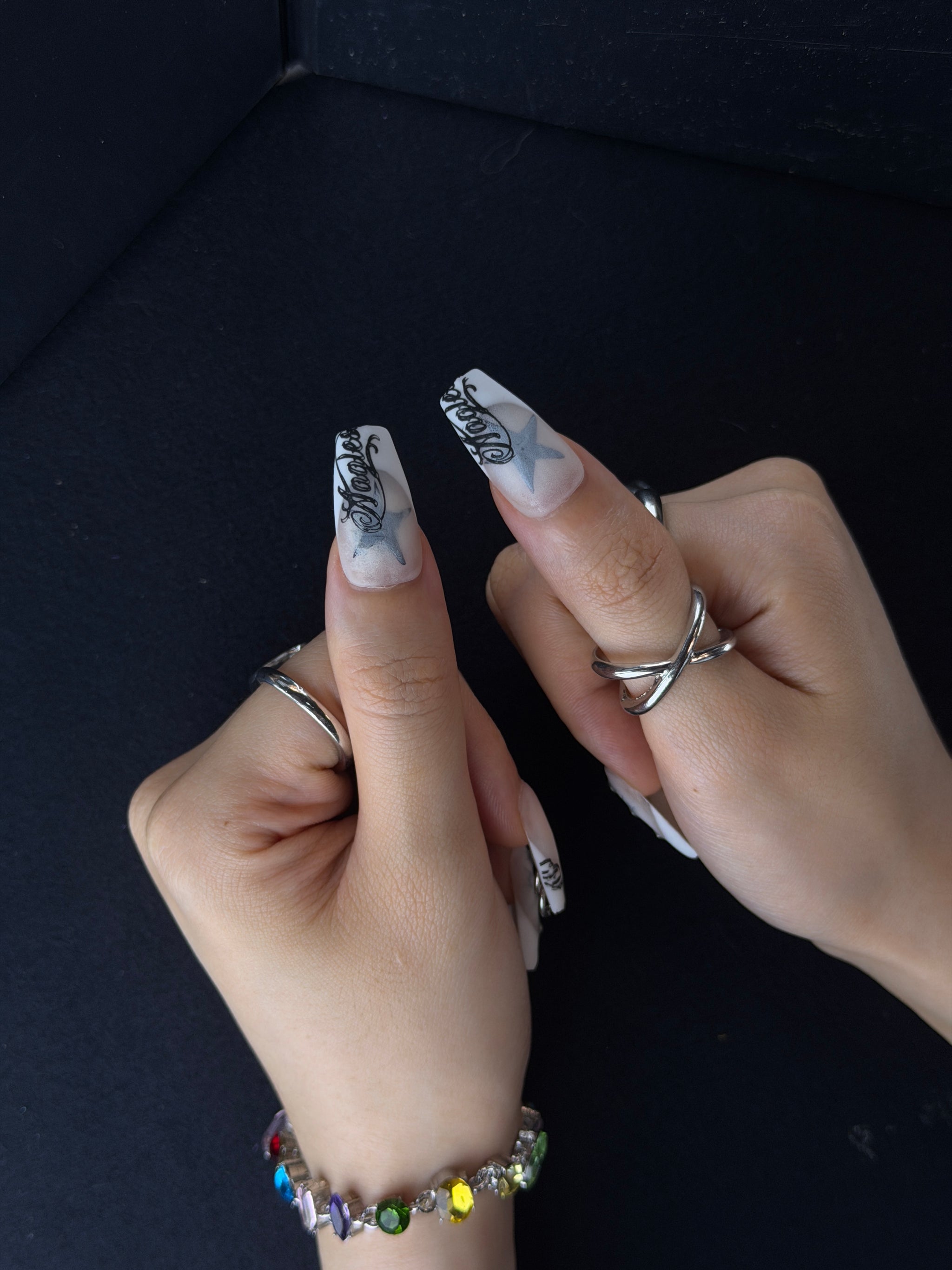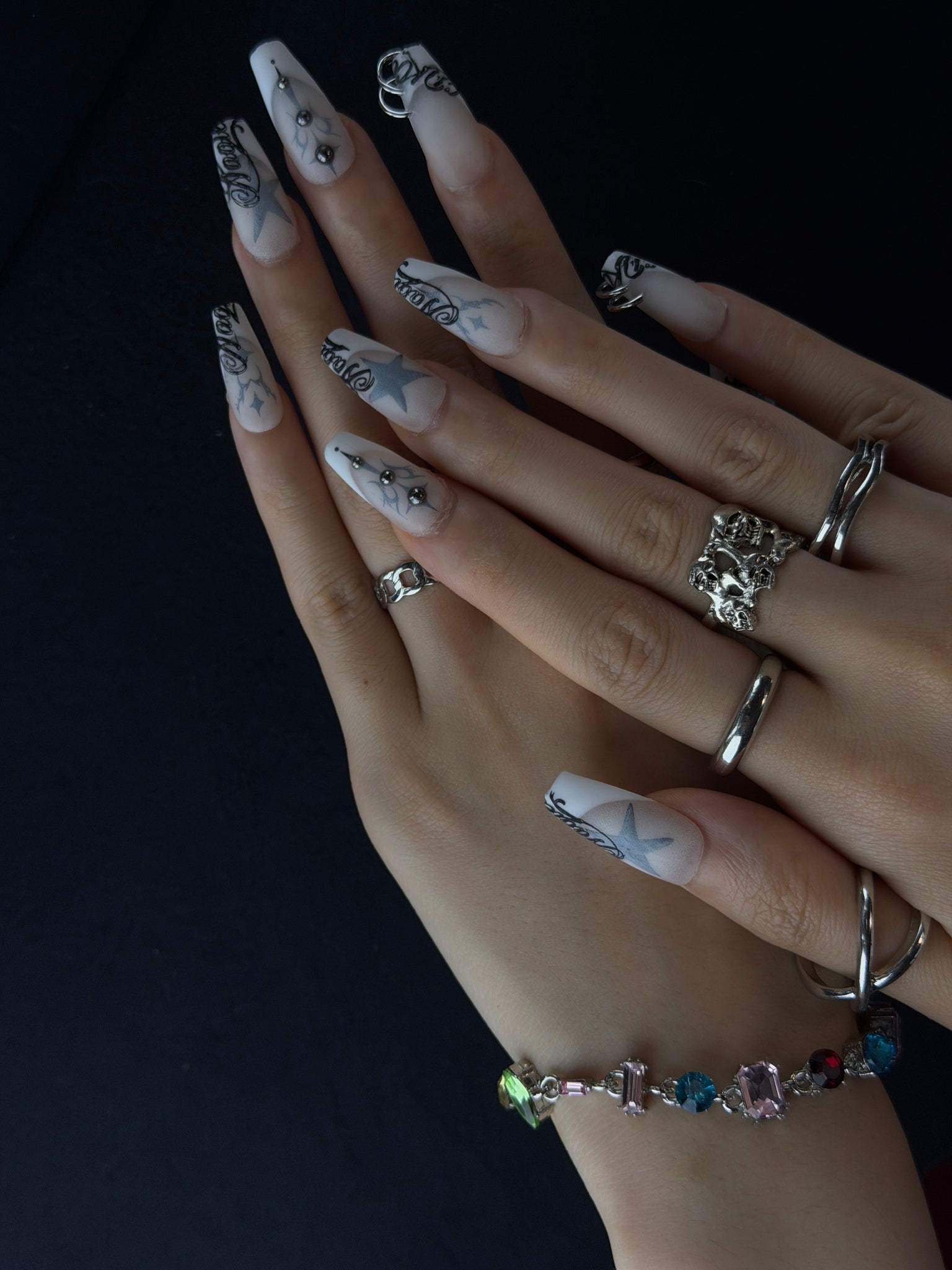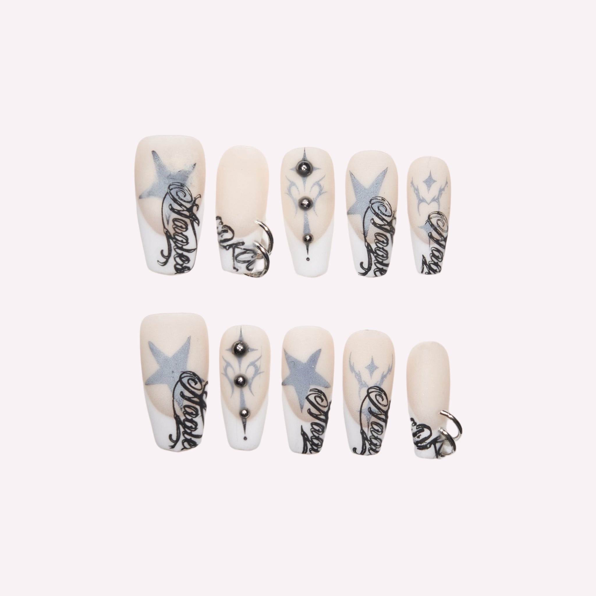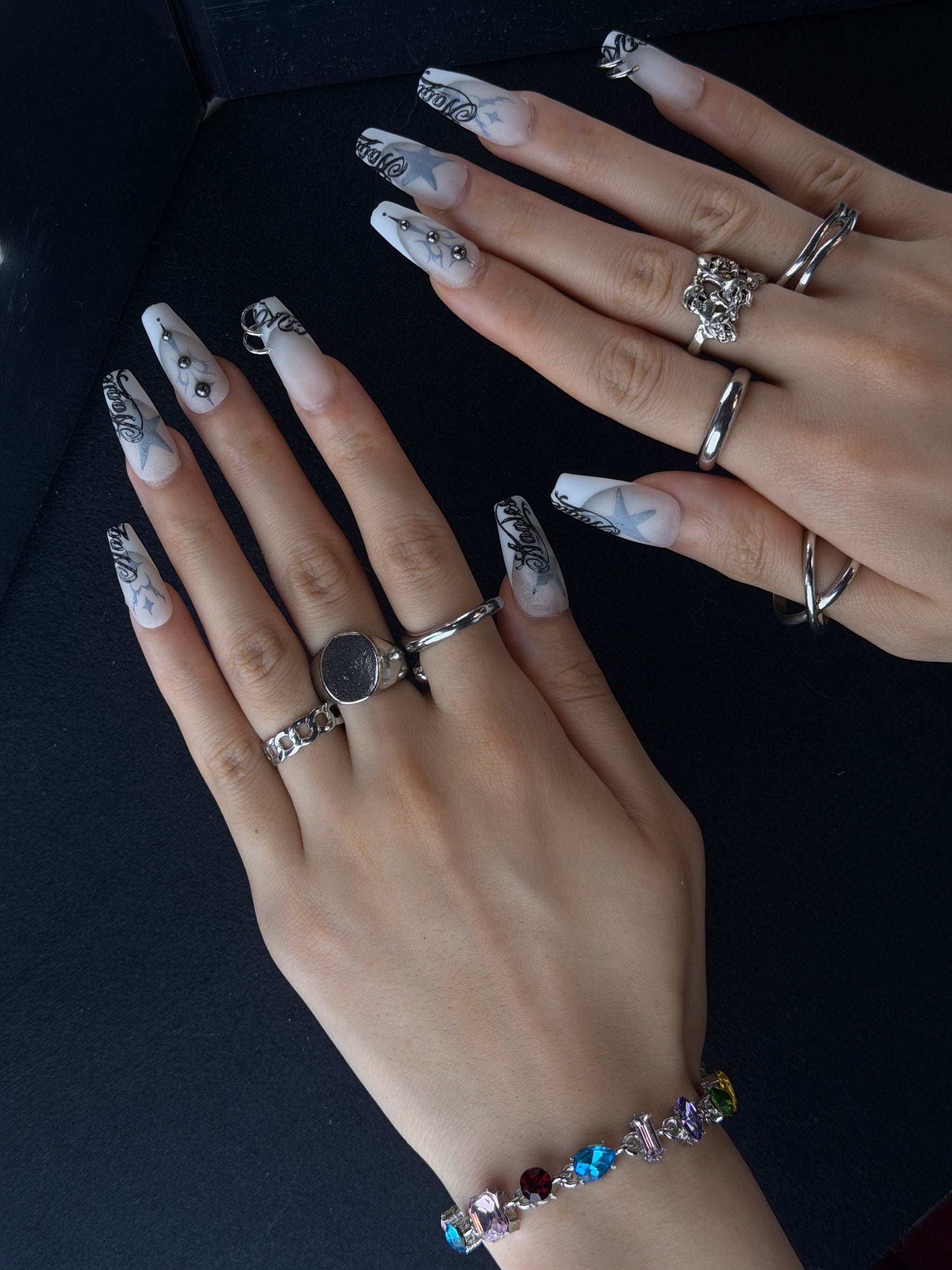 Hand-painted silver star motifs paired with black cursive script, bringing a rebellious, streetwear-inspired flair. Intricate tribal-inspired patterns with vertical silver spike studs, adding a sharp, edgy texture. Delicate silver ring charms that wrap around the nail edge, infusing a subtle punk-gothic mystery. The matte, soft-touch finish enhances the neutral nude base and makes the silver and black graphic details pop, creating a cool, understated aesthetic that balances soft minimalism with bold alternative energy.