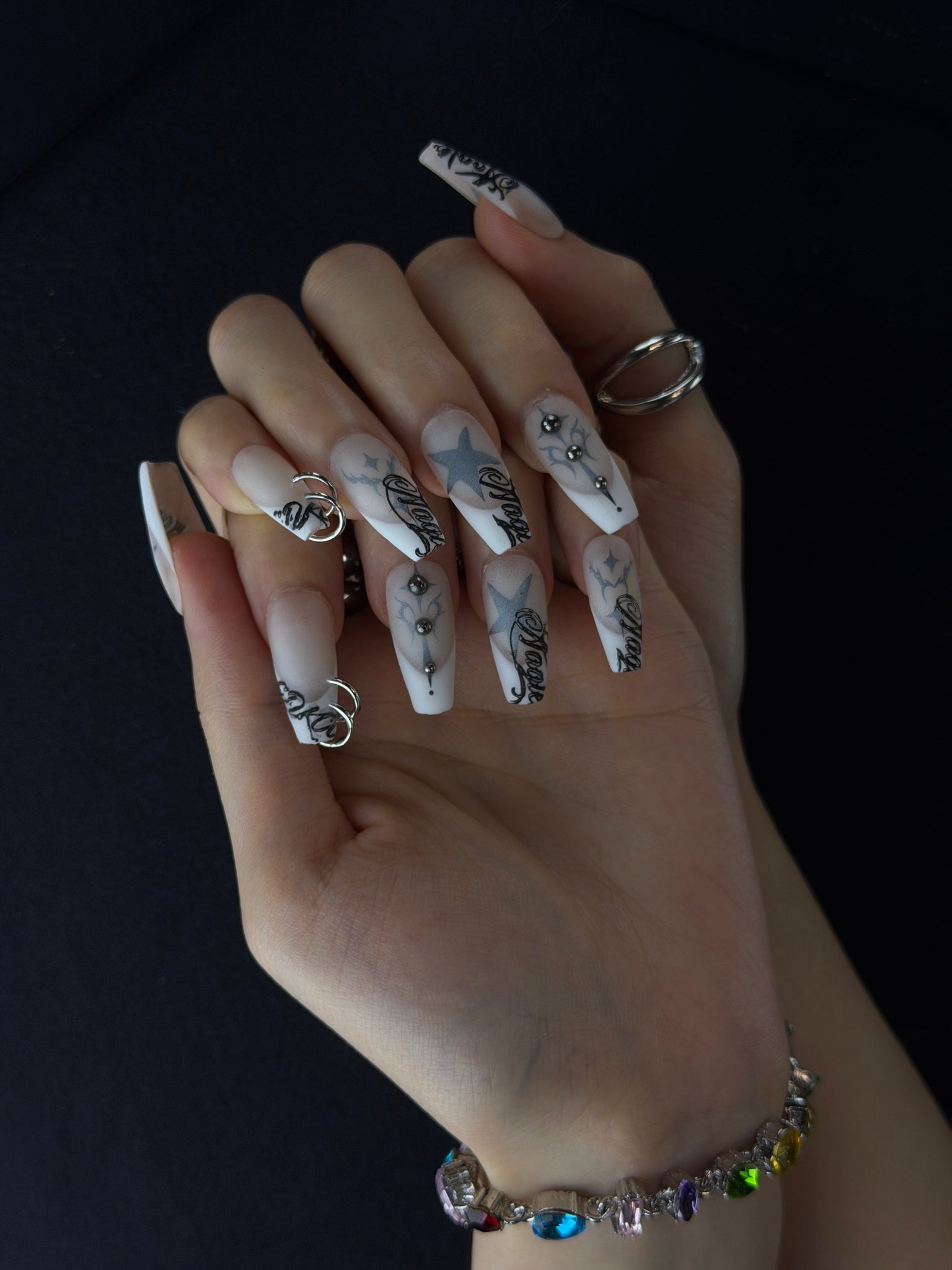 This set features a soft milky nude base with crisp white French tips, elevated by handcrafted details that evoke 2000s punk and tattoo culture: