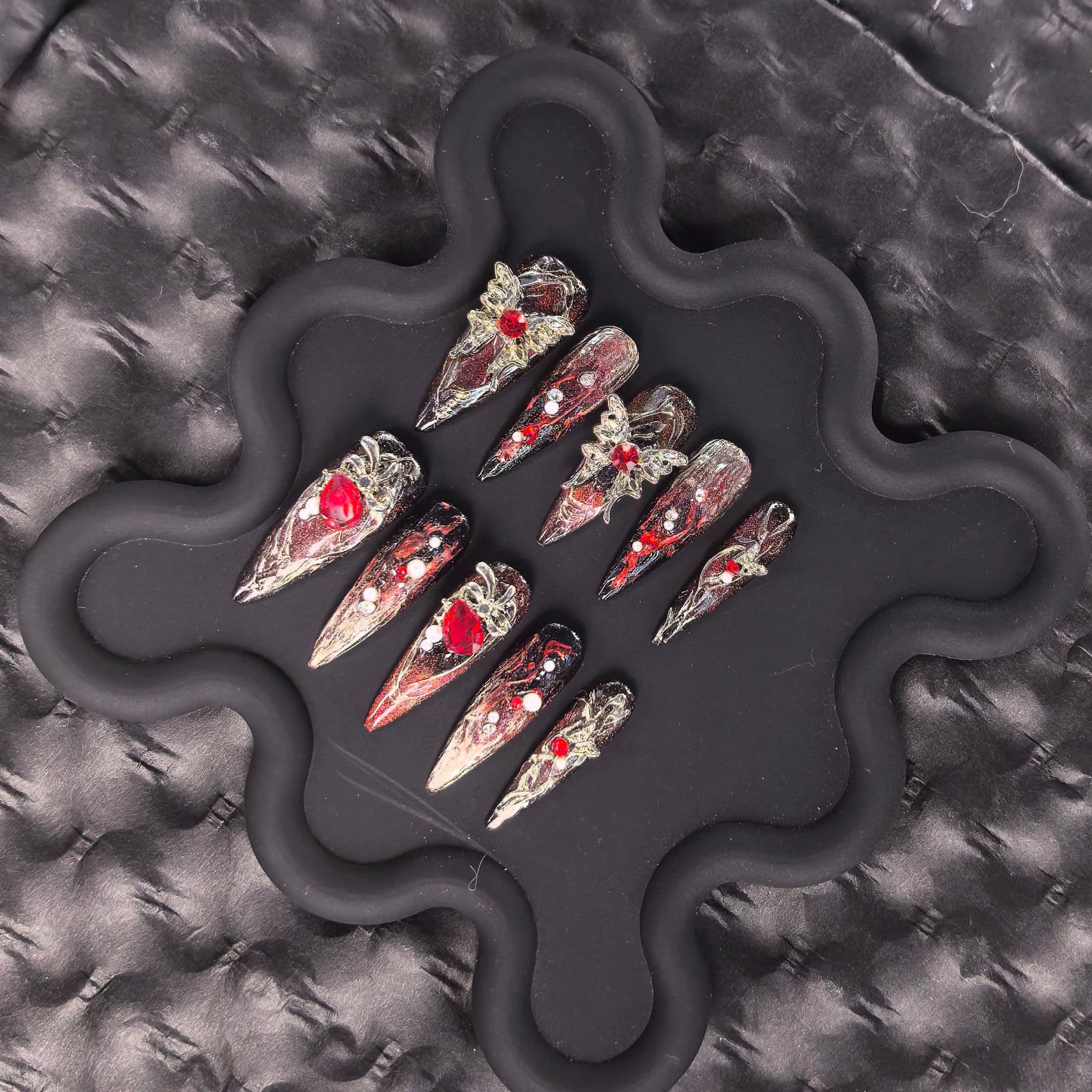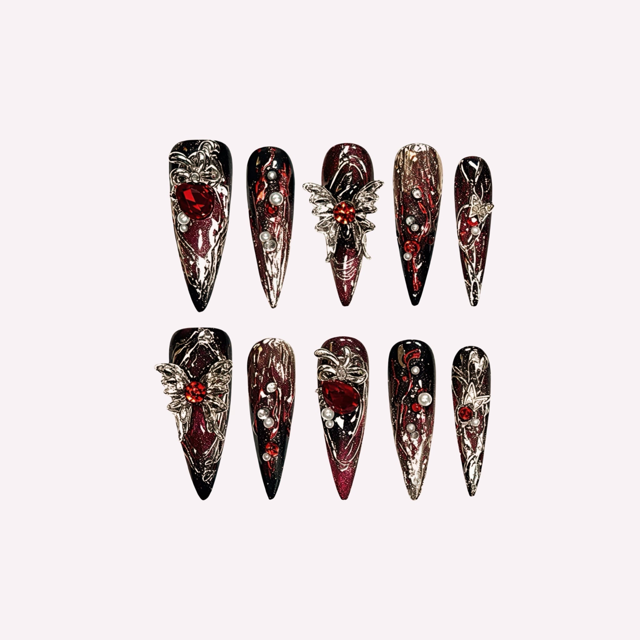 Step into a world of gothic - romantic charm with these Press - on Nails. This set showcases a striking mix of dark red and black bases, gracefully decorated with intricate silver - textured patterns, shimmering red gem - like accents, and delicate pearl embellishments. Some nails are adorned with eye - catching butterfly and gem motifs, adding a touch of mysterious allure to your style. Accentuated with these elaborate details, it captures the essence of a classic and edgy aesthetic, blending the charm of a gothic fairy tale with a hint of feminine allure. Perfect for those who want to exude confidence and embrace a touch of timeless, unique beauty.