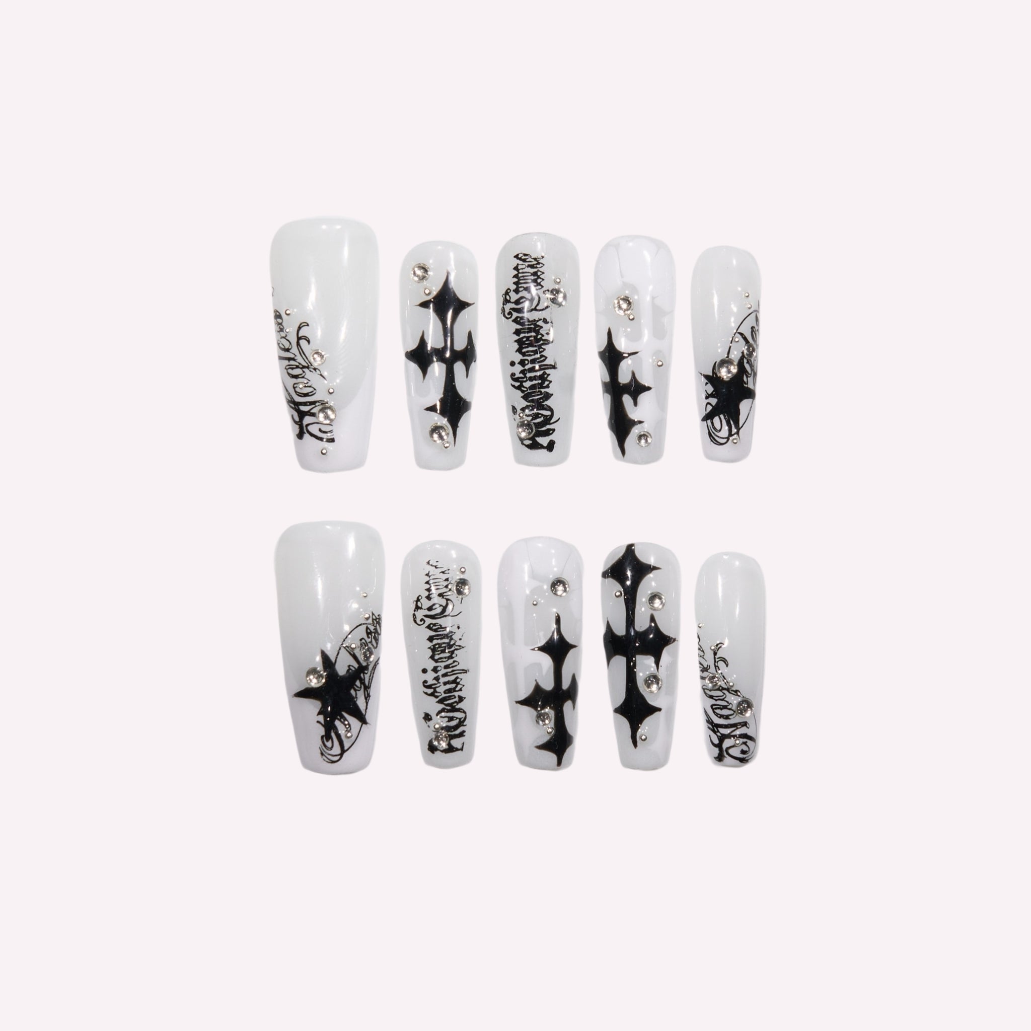 Step into a world of edgy gothic punk charm with this Handmade White & Black Cross Script Press-on Nails set—crafted for the bold alternative fashion lover who adores rebellious, tattoo-inspired nail art that blends clean minimalism with dark, symbolic edge! Made from acrylic PMMA, this biodegradable, skin-friendly material fits nails seamlessly, boasts micro-elasticity to resist chipping and breaking (far sturdier than flimsy plastic alternatives), and mimics the natural, lifelike finish of salon-quality sculpted nails. This set features a crisp milky white base, elevated by handcrafted details that evoke gothic and punk street culture: bold black gothic cross motifs with sharp, angular points bring a fierce, rebellious energy, while intricate black cursive script wraps across the white base like hand-painted tattoo art. Tiny clear crystal studs add a touch of refined sparkle to the stark white base, enhancing the contrast between soft minimalism and bold alternative power. The glossy, high-shine finish amplifies the crisp white base and makes the black cross and script details pop, creating a striking, monochromatic aesthetic that balances clean elegance with fierce gothic attitude. Every nail is hand-finished to preserve the precision of cross and script patterns, the sparkle of crystal accents, and the smoothness of the white base—ensuring the gothic punk vibe shines through in every polished, striking touch. Unlike fragile plastic nails, our PMMA press-ons retain their intricate decorative details, durable textured finish, and snug fit through daily wear, from music festivals to dark romantic social outings. Ideal for lovers of gothic punk, tattoo-inspired, and minimalist alternative nail art, this set lets you embrace effortless, cool-edge charm with reusable, long-lasting convenience.