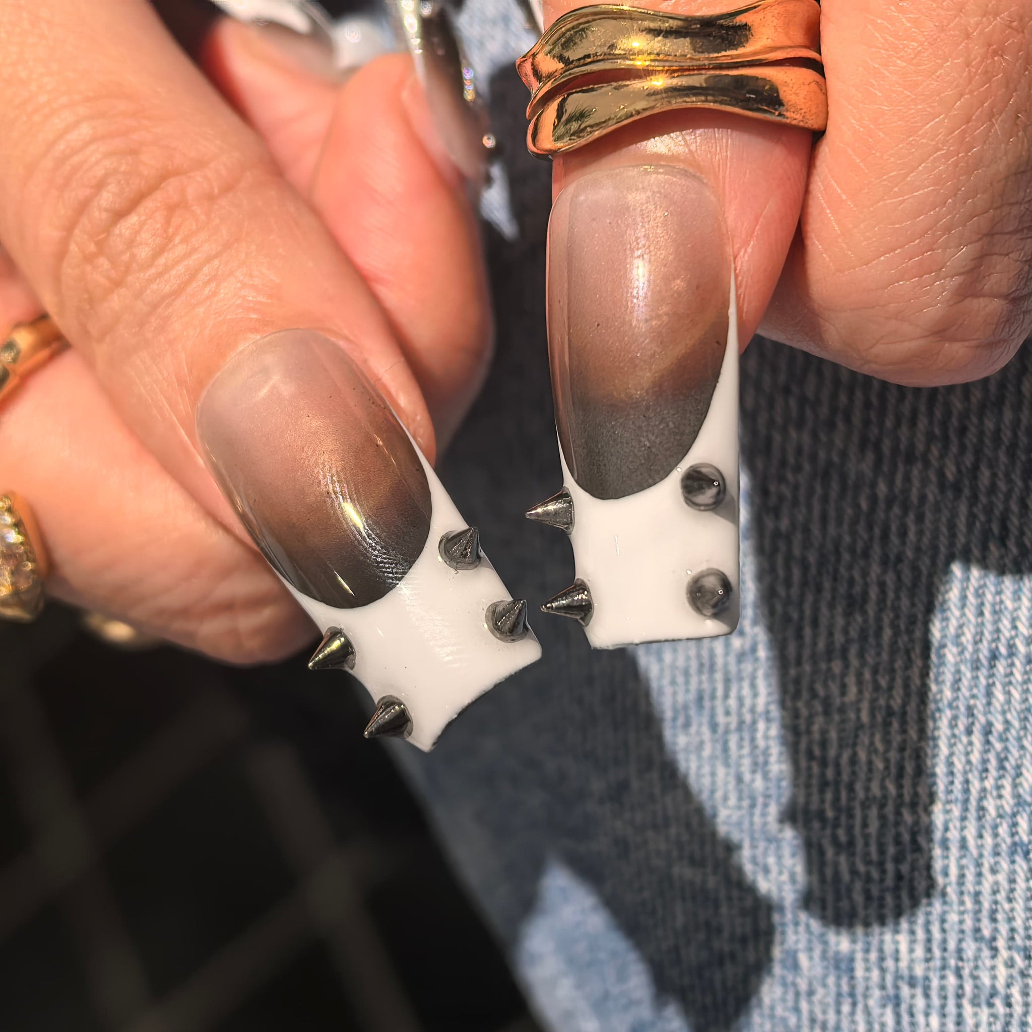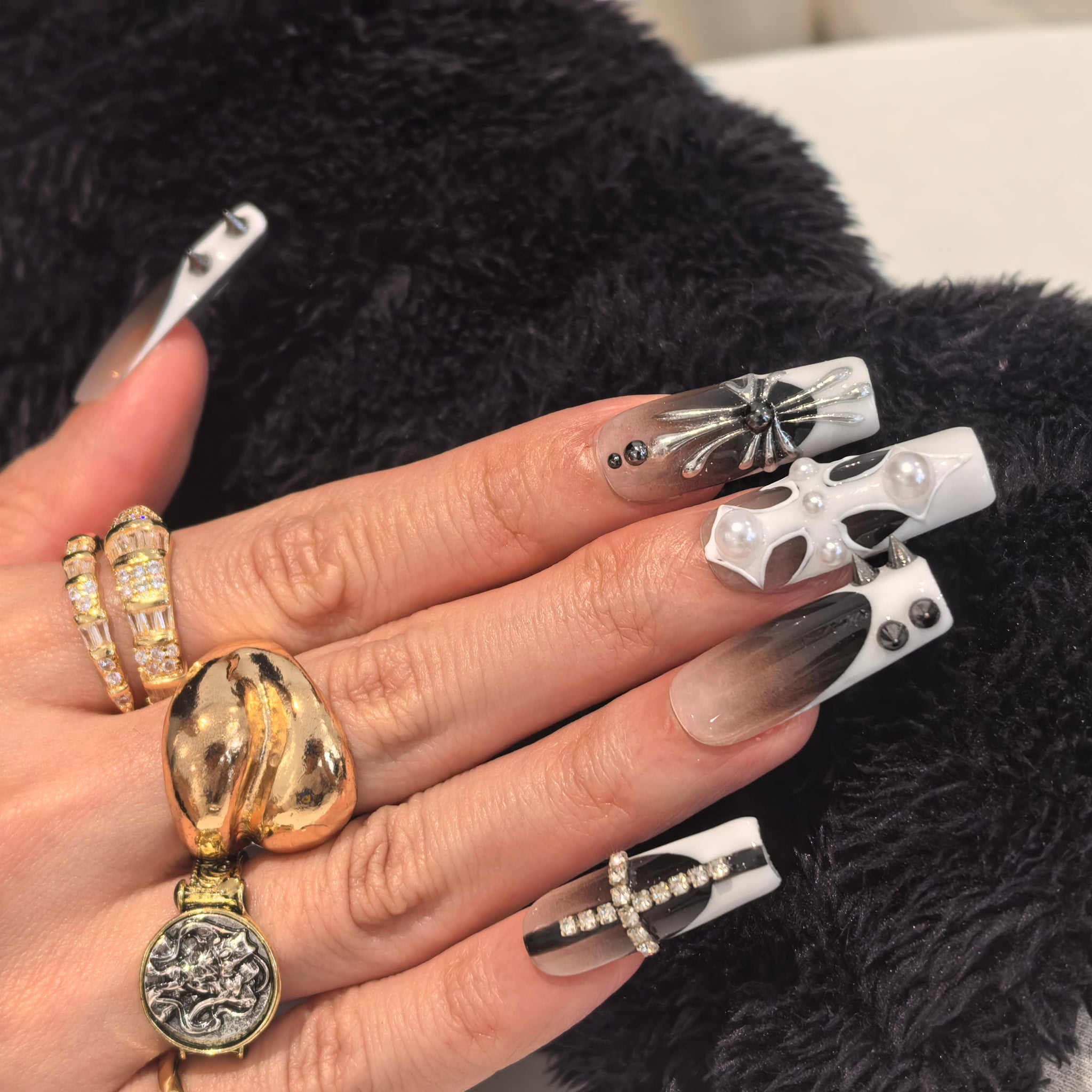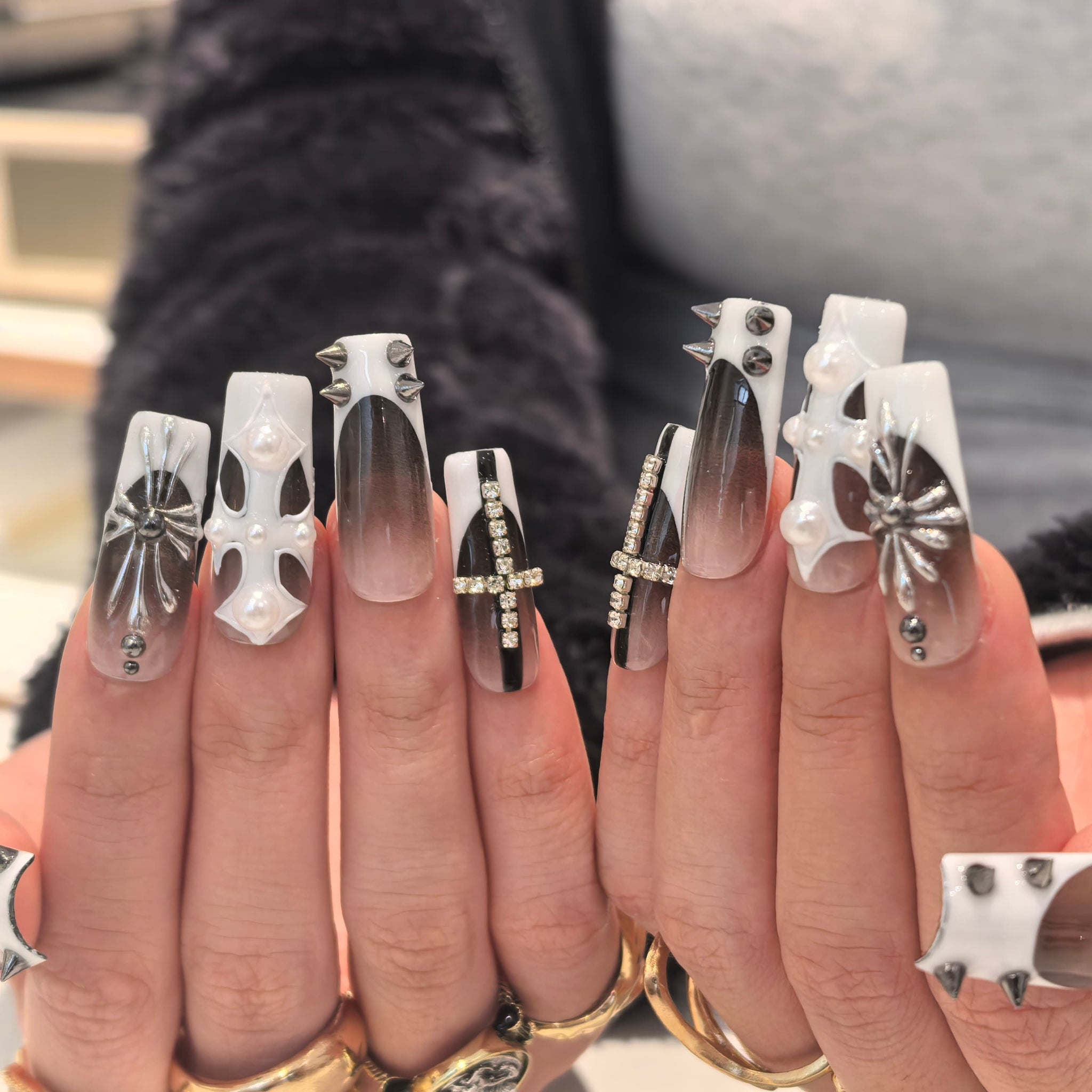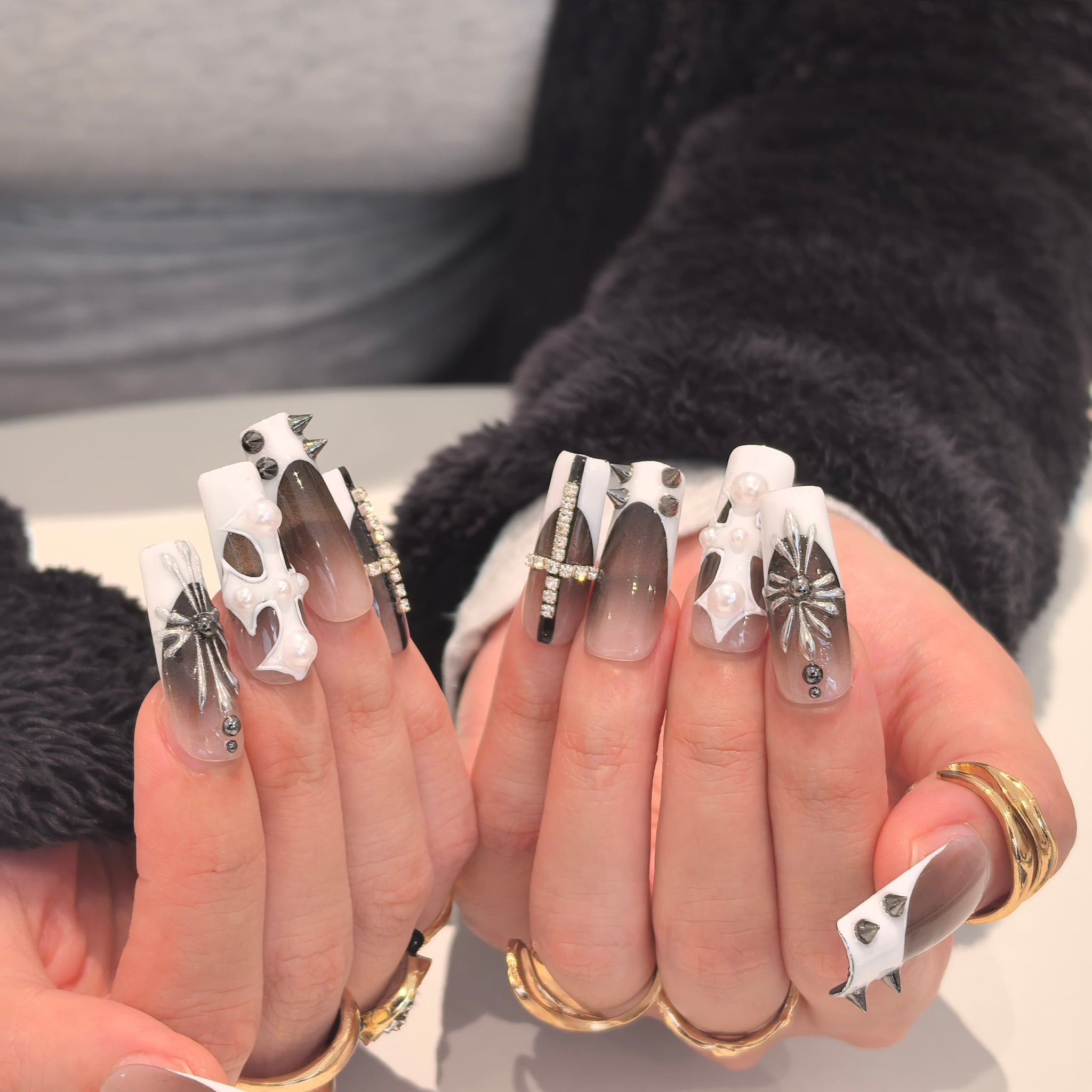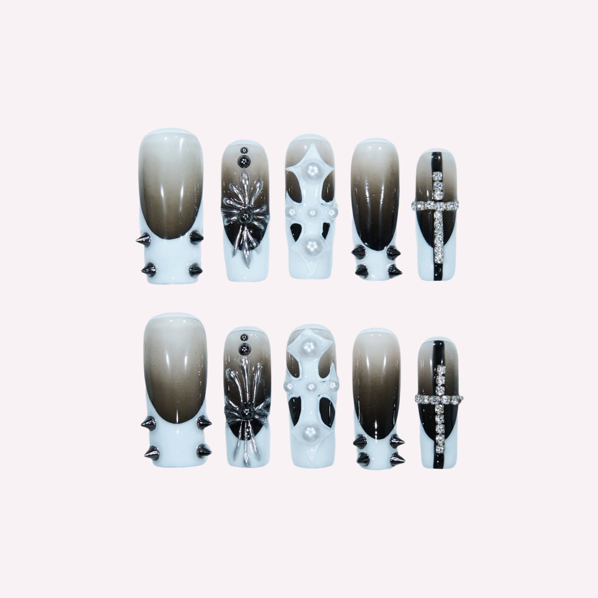 Step into a world of edgy-luxury monochrome charm with our Handmade Press-on Nails, crafted from acrylic PMMA—a biodegradable, skin-friendly material that fits nails like a seamless custom fit. This set showcases sleek gray-white gradient bases, adorned with meticulous handcrafted details: bold black stud accents, metallic spider embellishments, pearl-inlaid cutout designs, and diamond-embellished cross decorations, all designed to blend sharp monochrome contrast with sophisticated edgy luxury. Unlike flimsy plastic nails, our PMMA press-ons feature micro-elasticity to resist breaking, while their lifelike, glossy texture mimics real nails for a polished, high-impact look. Accentuated with cool gray-white tones and striking decorative elements, this handmade acrylic PMMA coffin press-on nails set captures the essence of a bold, refined aesthetic—blending edgy-chic flair with durable, exquisite craftsmanship. Perfect for anyone seeking statement-making, long-lasting nail art, it’s ideal for exuding confidence while enjoying the convenience of reusable, eco-friendly nails.